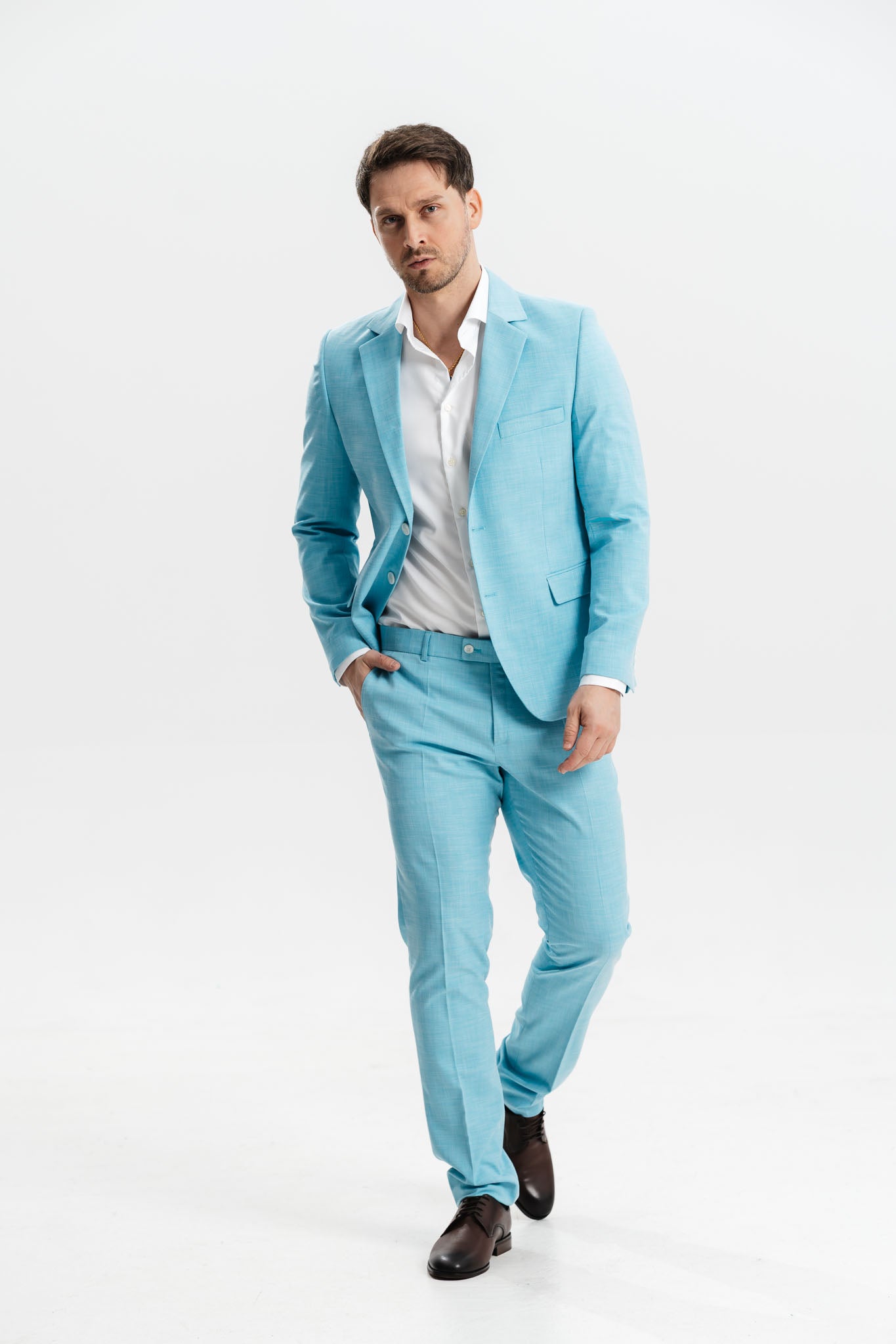 Alege sa te remarci cu acest costum bleu slim, care nu doar ca iti va completa garderoba, dar iti va si evidentia personalitatea. Bucura-te de un look impecabil!