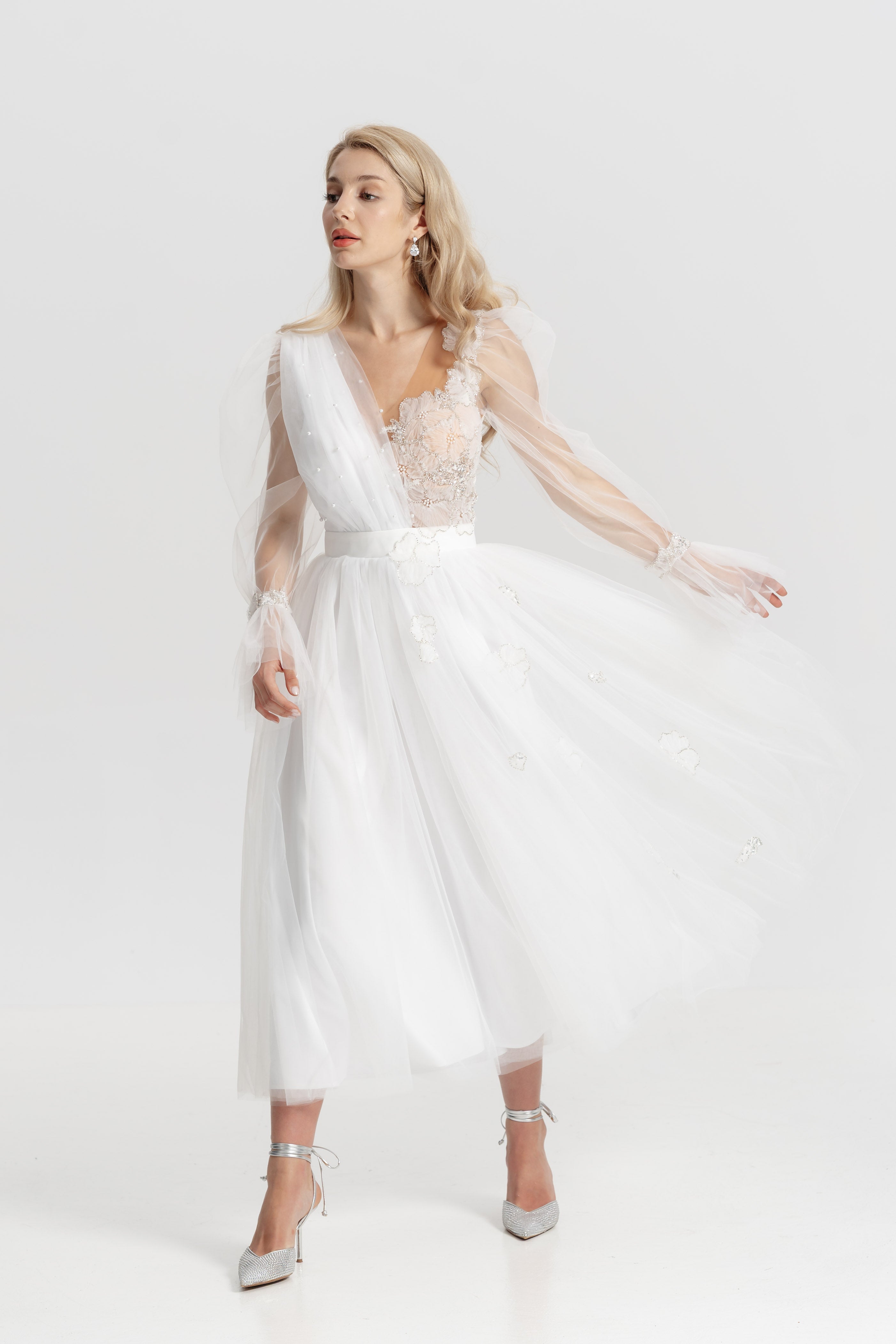 Straluceste cu aceasta rochie alba eleganta, perfecta pentru nunti, petreceri sau evenimente speciale. Designul sau delicat si detaliile florale iti vor adauga un aer romantic.