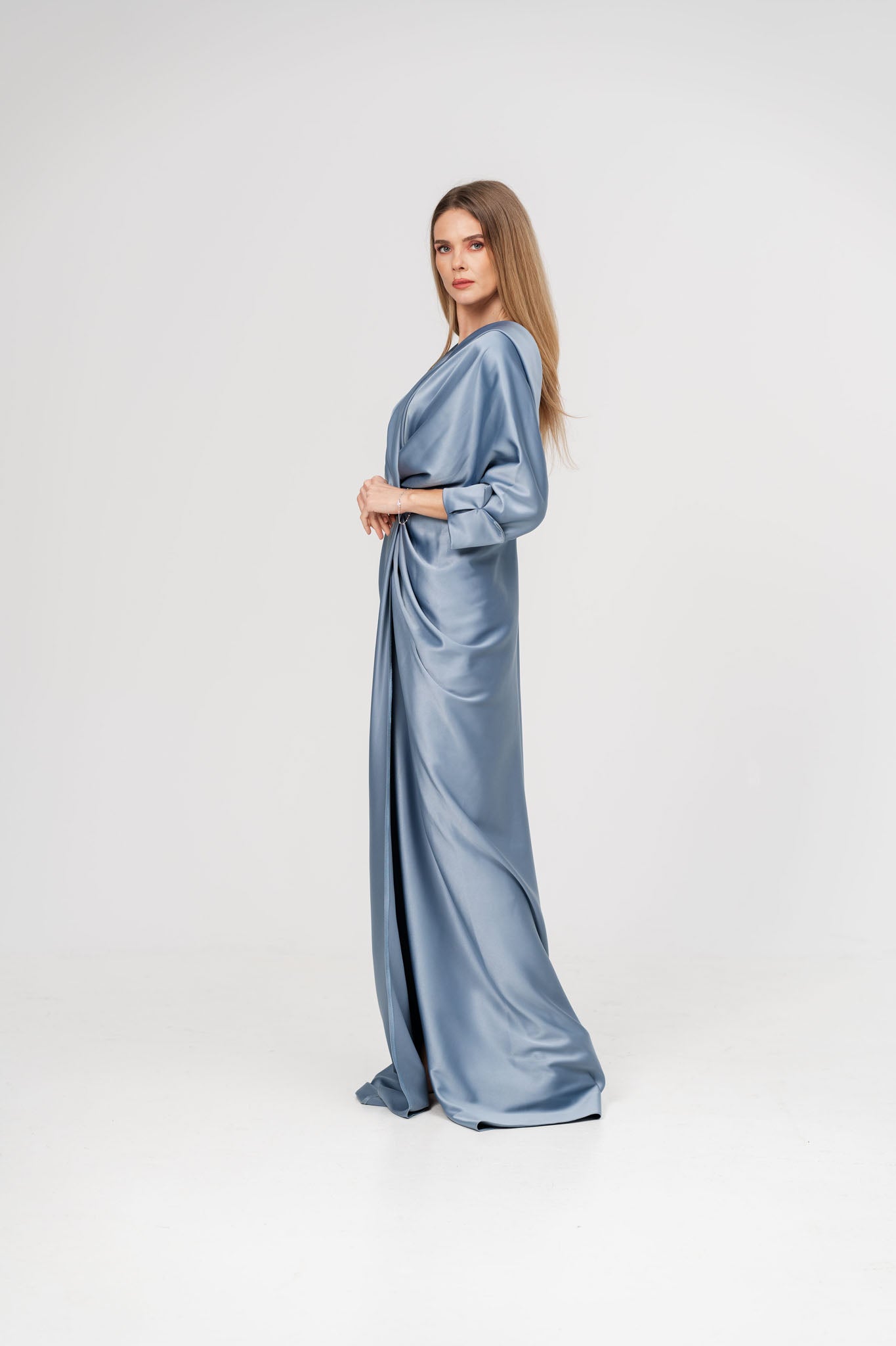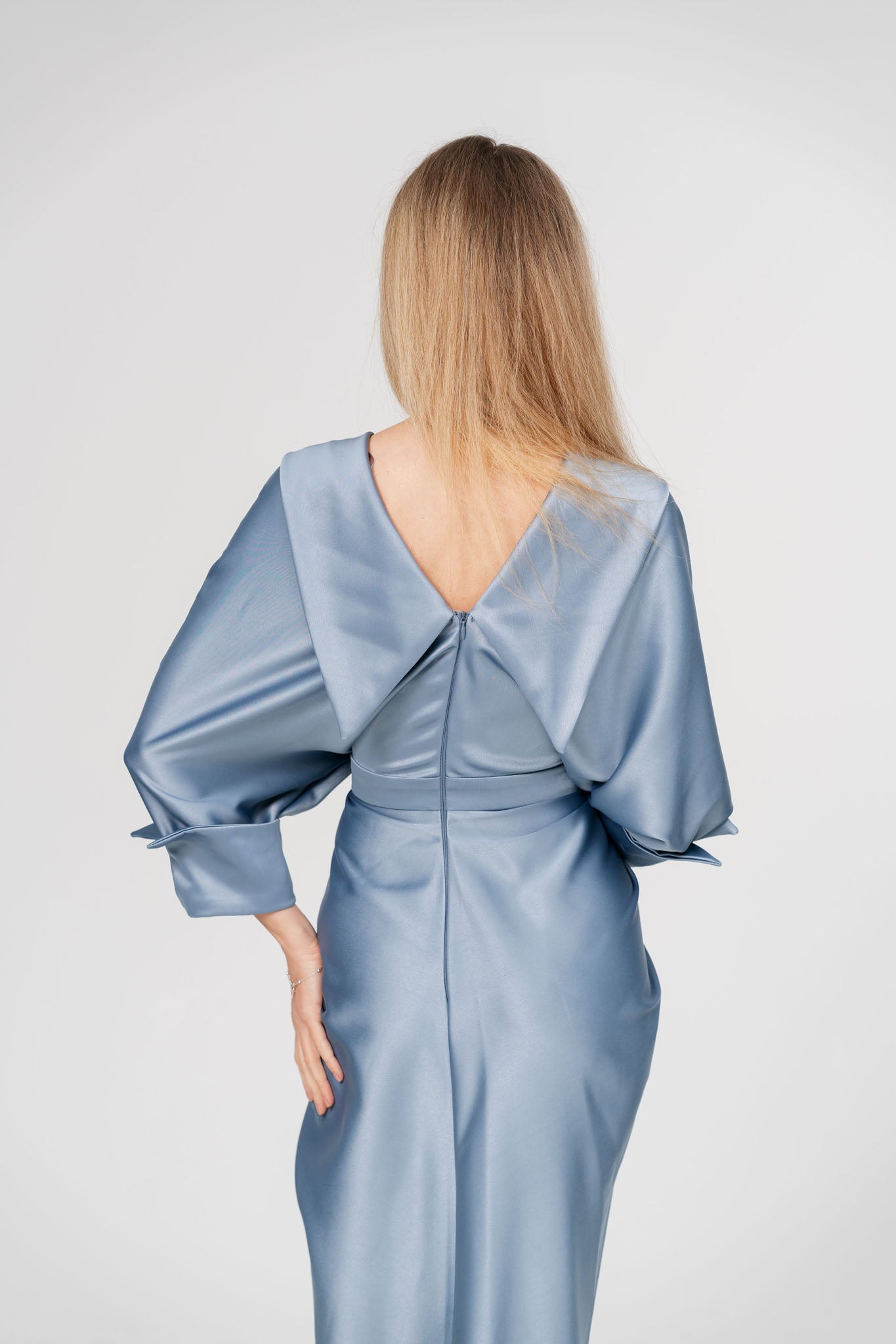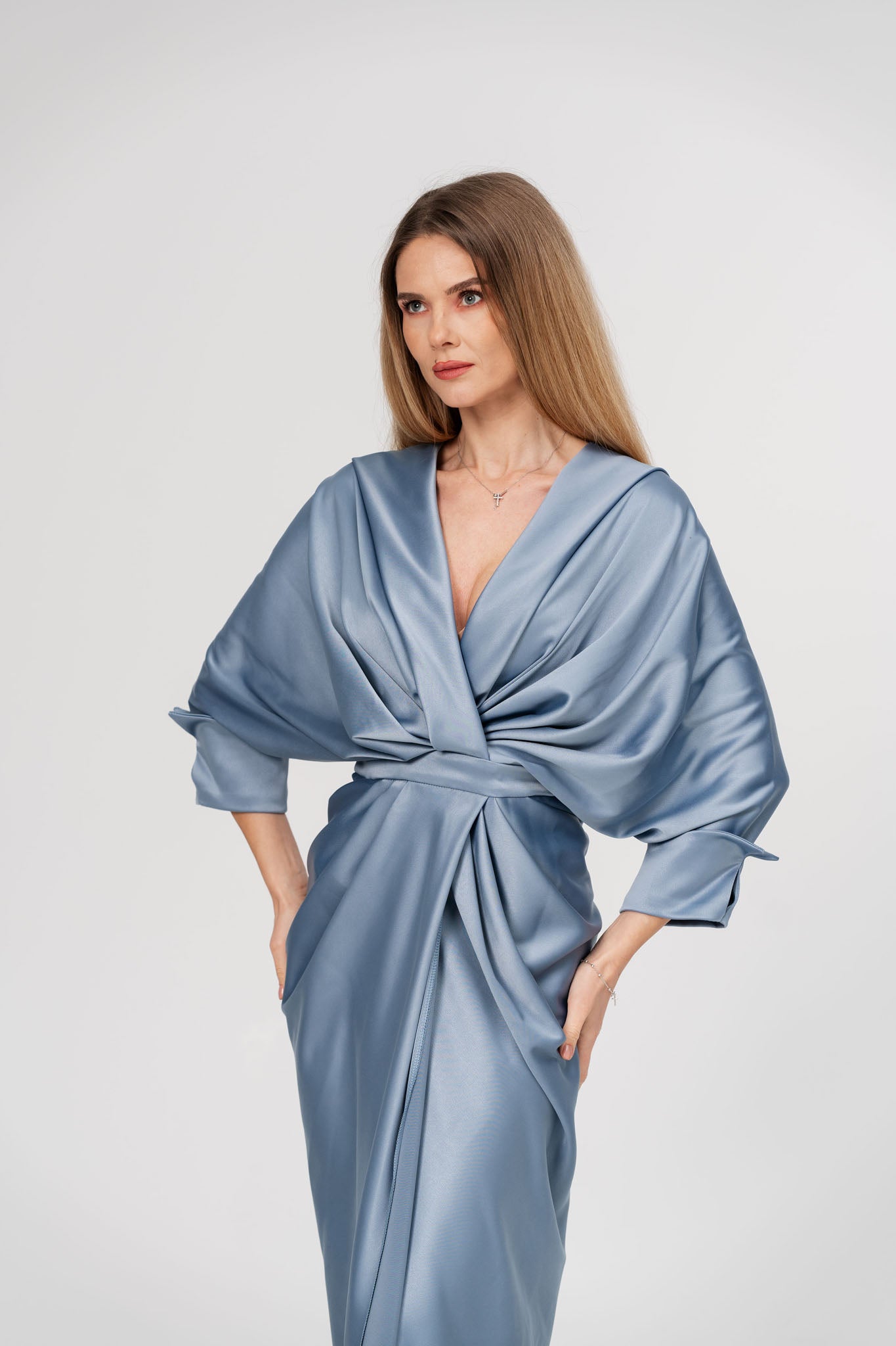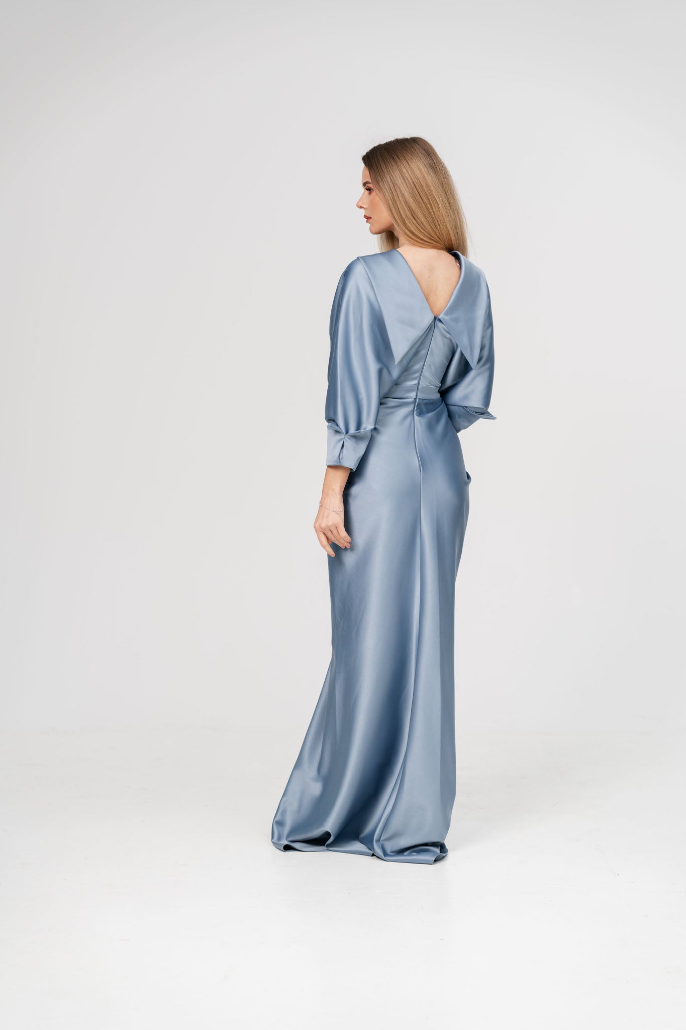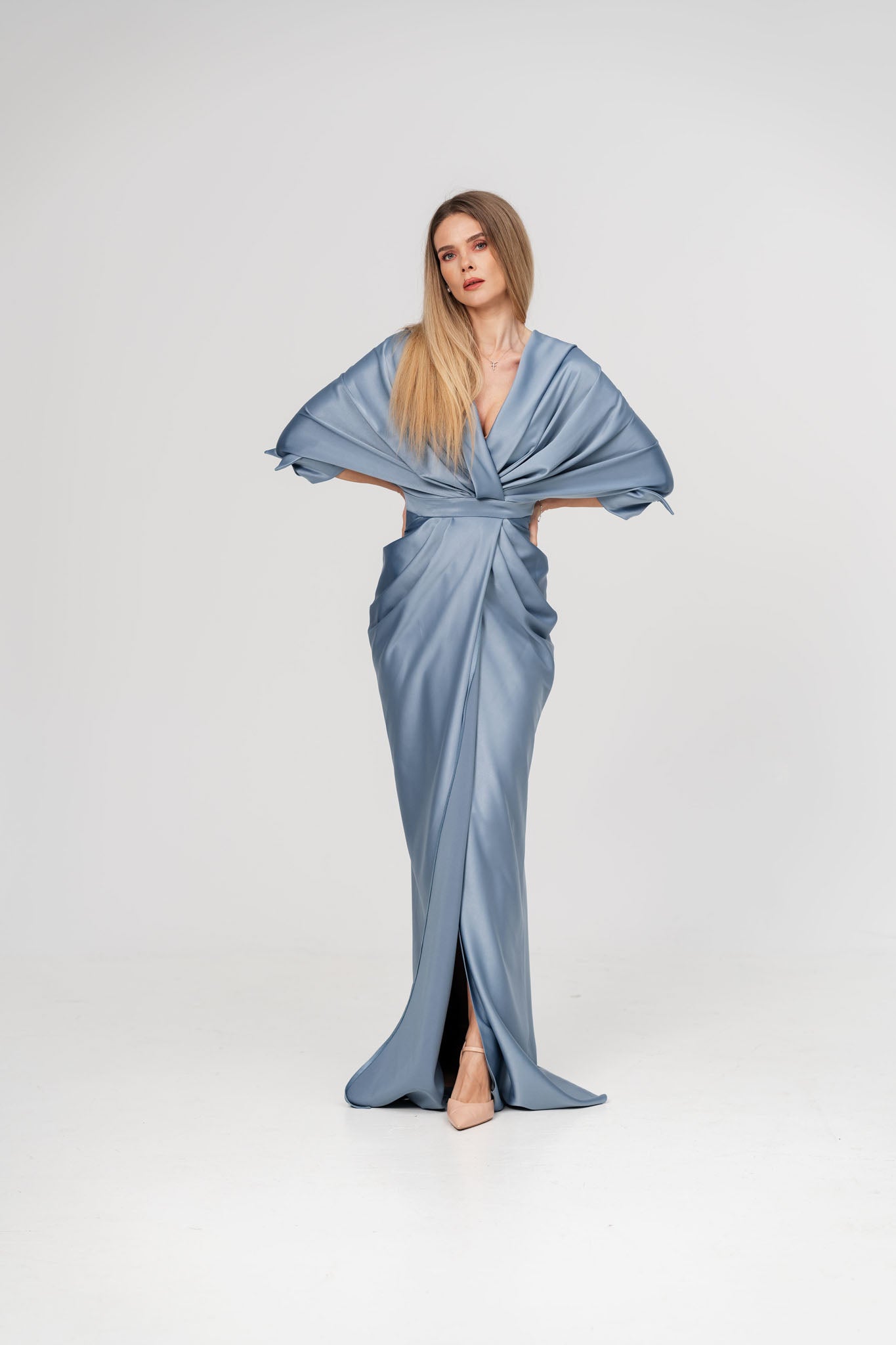 Aceasta rochie lunga din satin, cu un design sofisticat si feminin, este alegerea perfecta pentru o apariție memorabila. Decolteul adânc in V accentueaza elegant linia bustului, oferind un aer rafinat si senzual, iar crapatura centrala adauga un plus de fluiditate si grație in miscare. Materialul satinat cade lejer pe corp, evidențiind silueta intr-un mod elegant si modern.