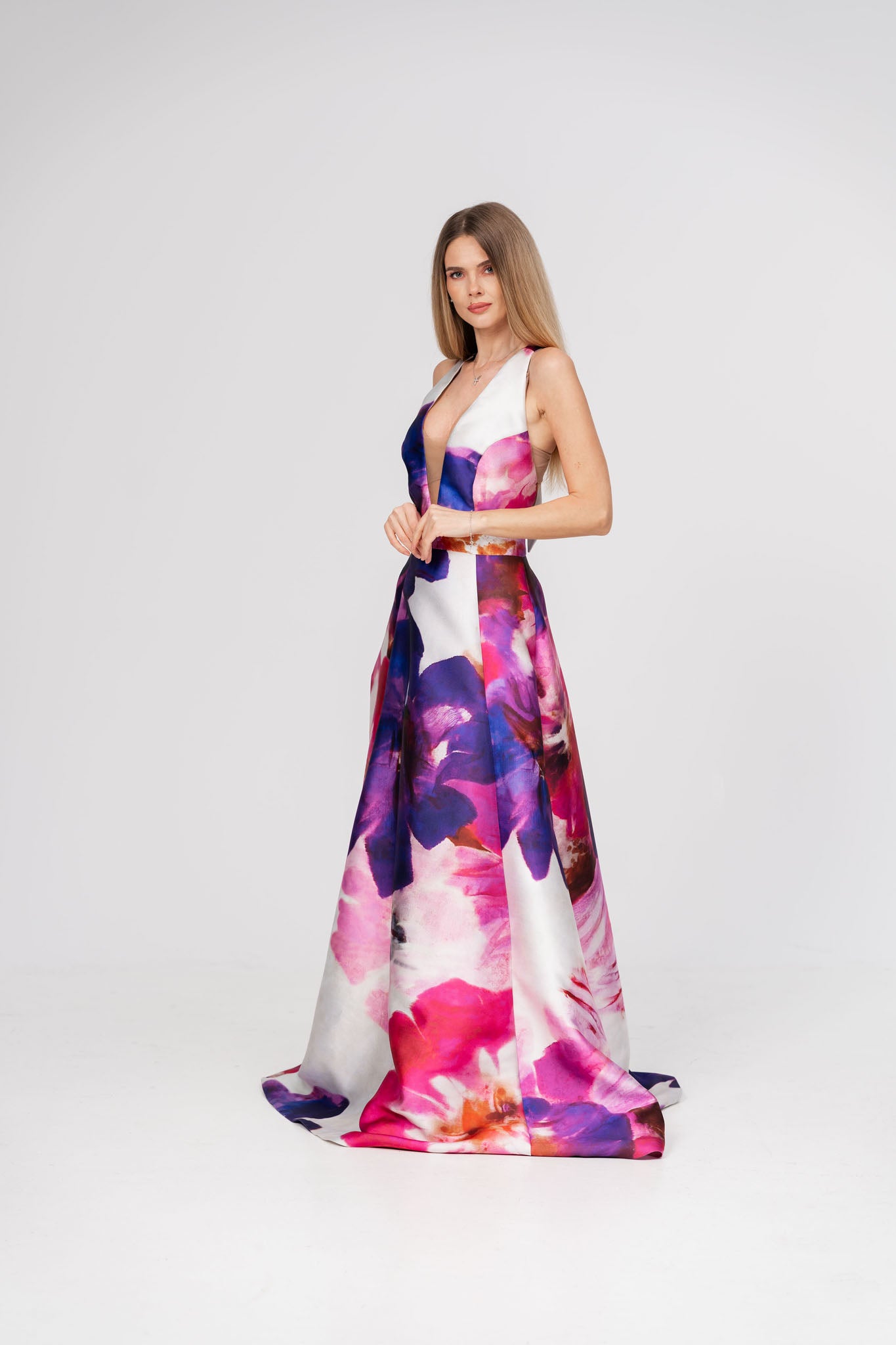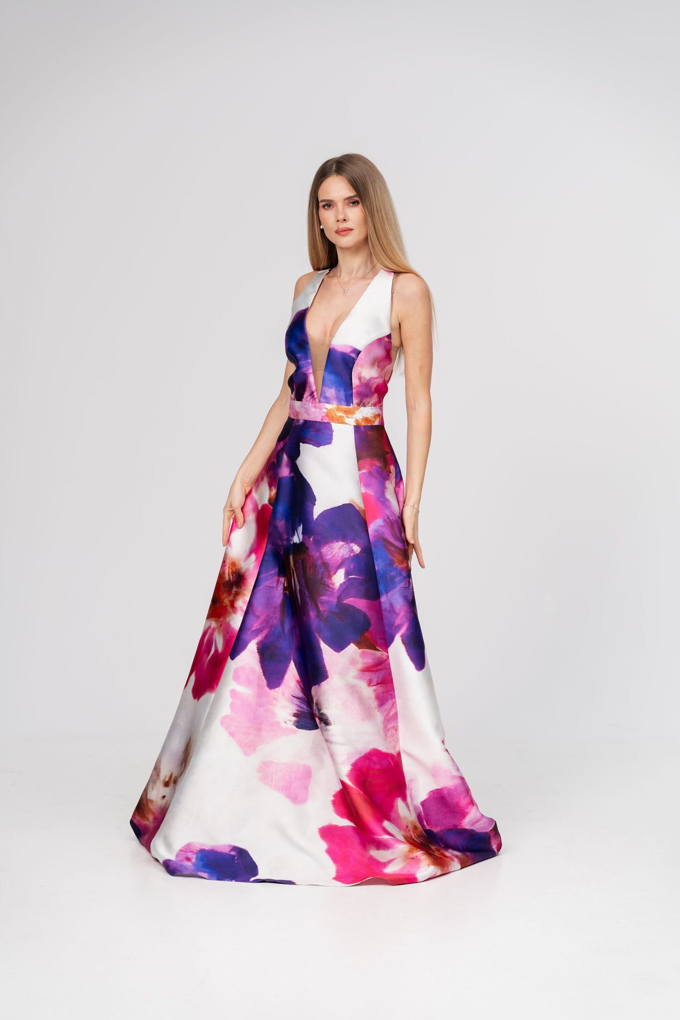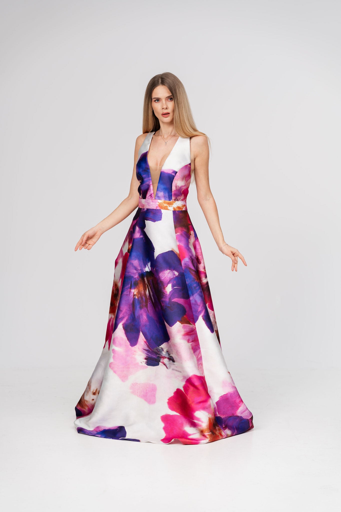 Aceasta rochie lunga din tafta cu imprimeu floral este alegerea perfecta pentru un look sofisticat si plin de gratie. Decolteul în V accentueaza delicat linia gatului, adaugand un plus de eleganta, iar materialul din tafta ofera un aspect luxos si structurat. Imprimeul floral aduce un aer romantic si rafinat, ideal pentru evenimente speciale.