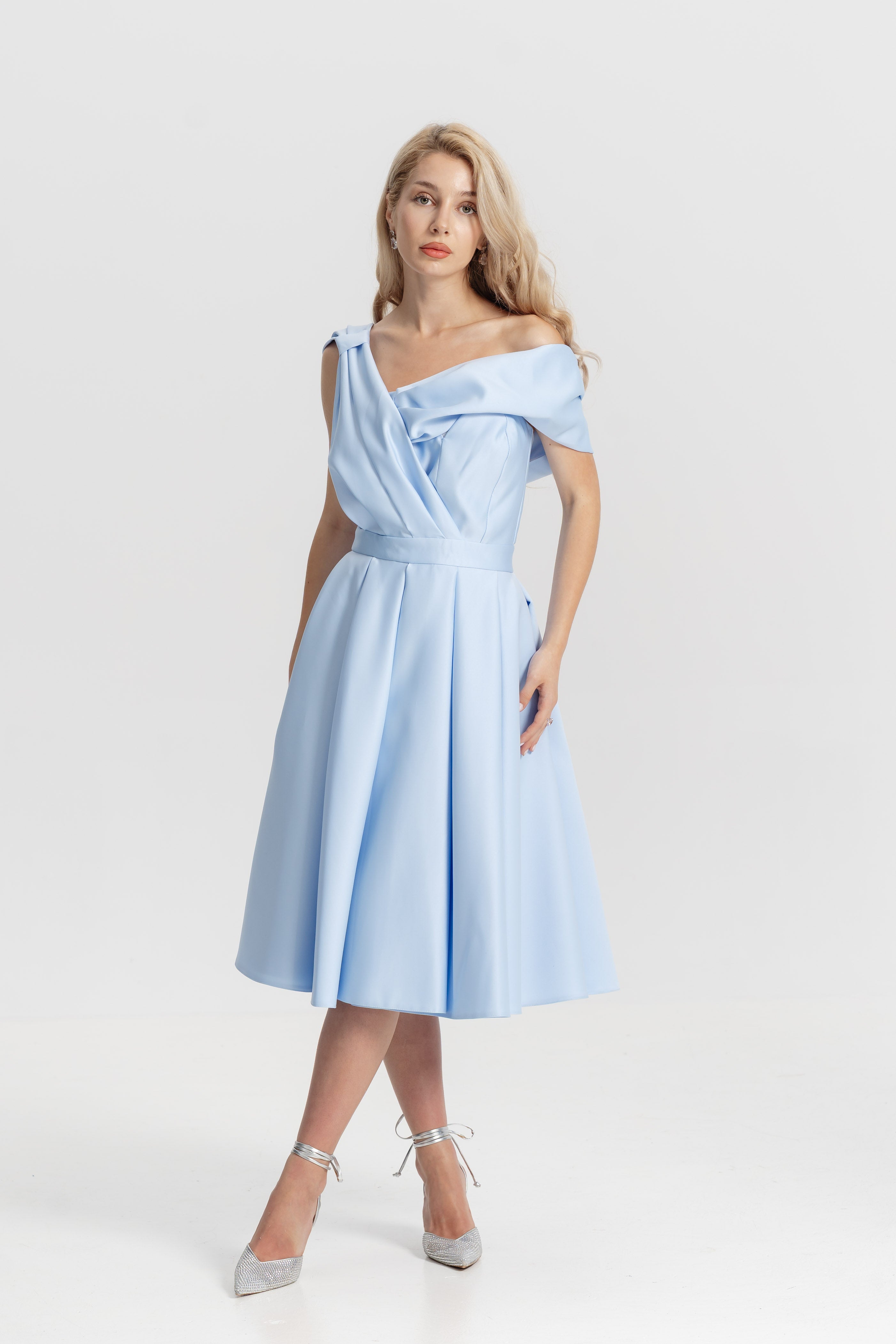 Aceasta rochie albastru deschis cu umeri decupati este alegerea ideala pentru femeile care doresc sa iasa in evidenta cu un look elegant si rafinat. Fie ca participi la o nunta, un cocktail sau o gala, aceasta rochie te va ajuta sa te simti fabulos.