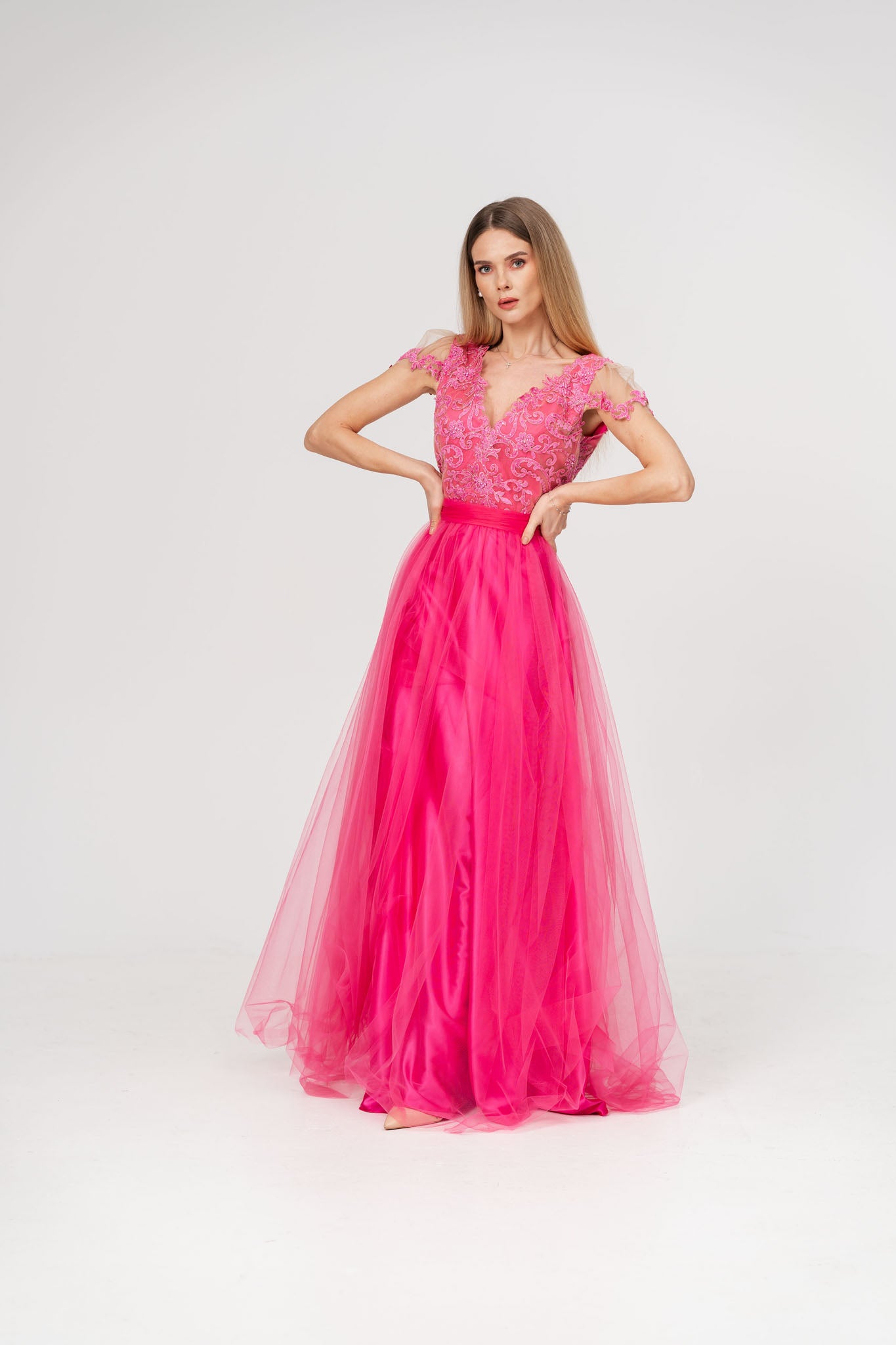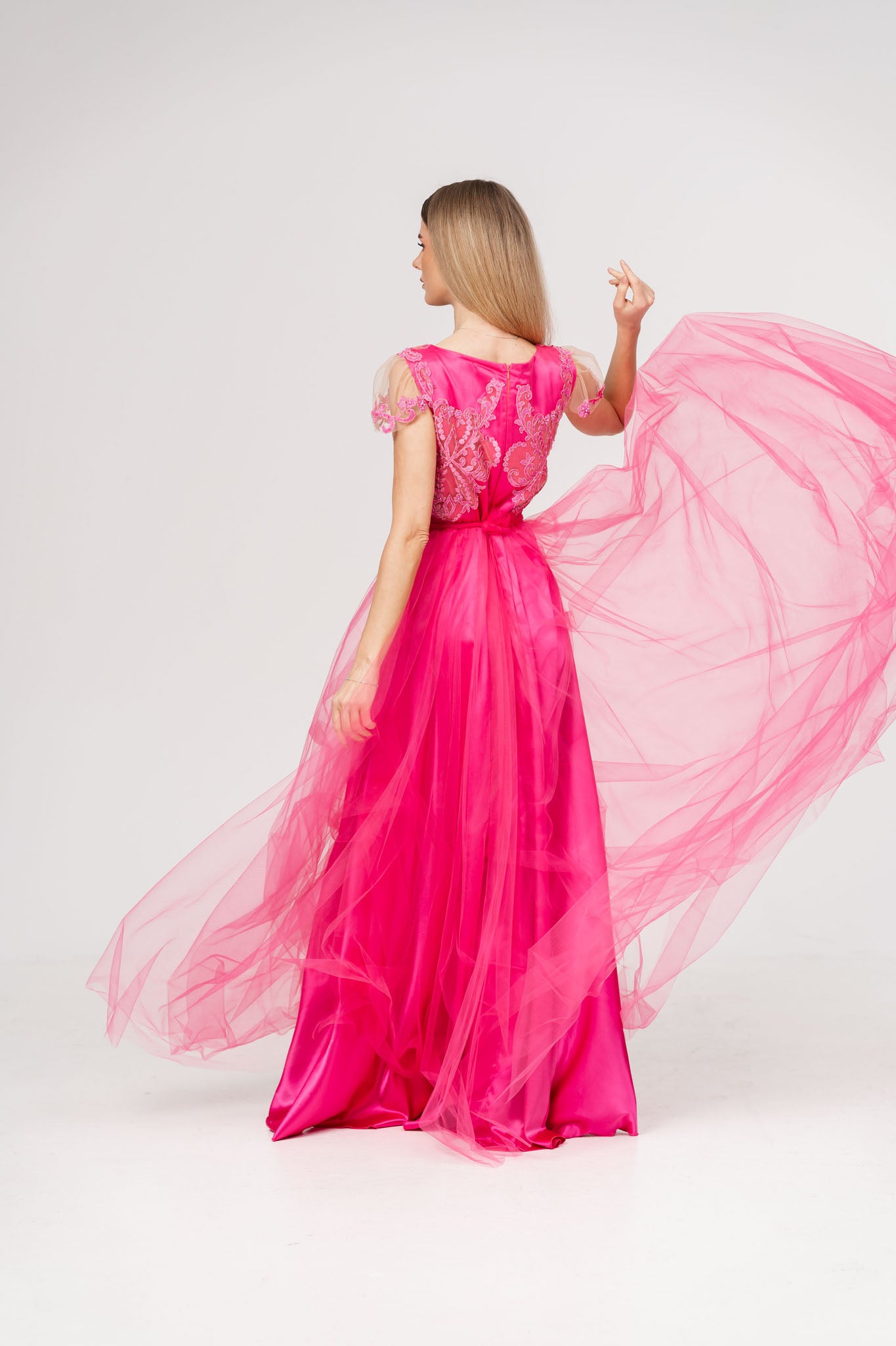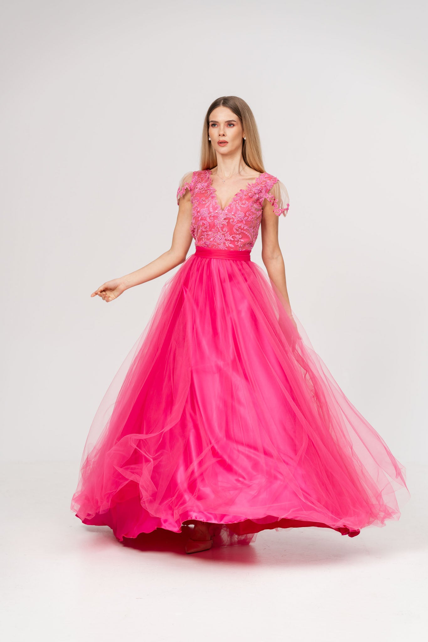 Aceasta rochie lunga din tul si satin este alegerea ideala pentru ocazii speciale, imbinand delicatetea dantelei cu fluiditatea materialelor fine. Corsetul decorat cu dantela atent lucrata ofera un aer sofisticat si feminin, in timp ce talia - marcata de un cordon elegant evidentiaza silueta si adauga un plus de eleganta. Fusta din tul vaporoasa creeaza un efect diafan perfect pentru un look gratios si rafinat.