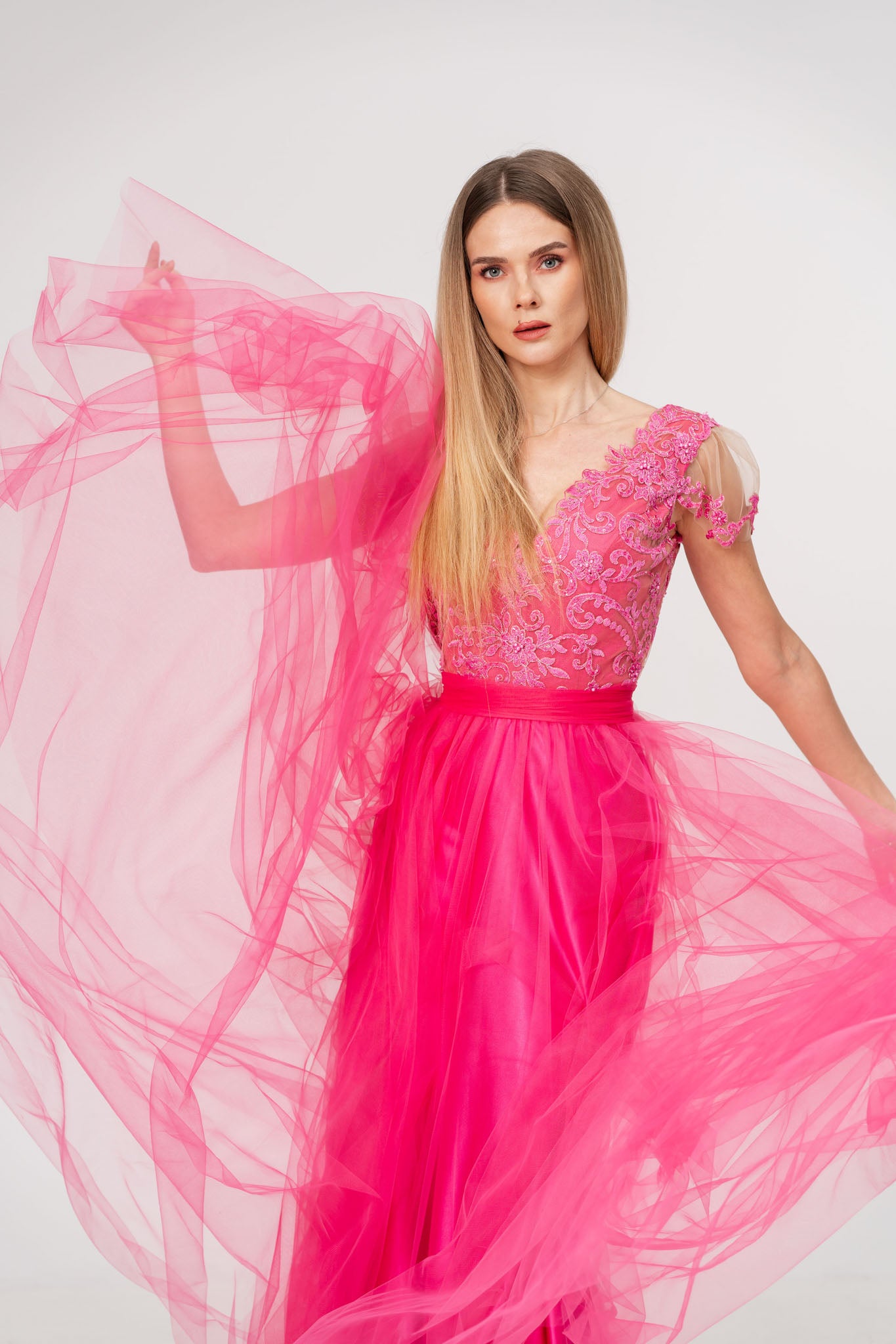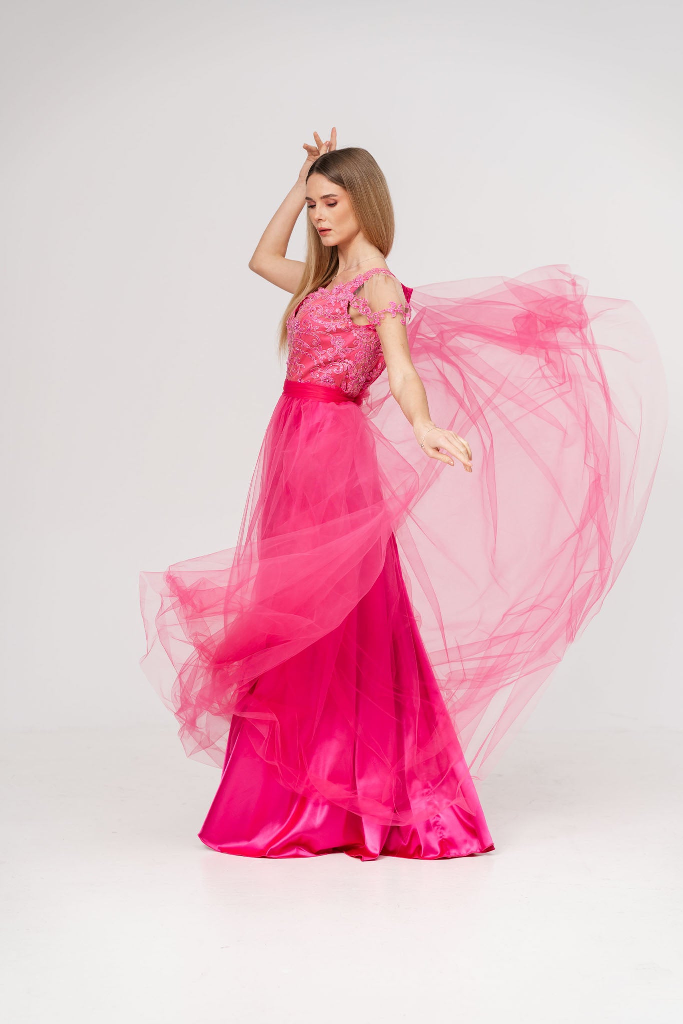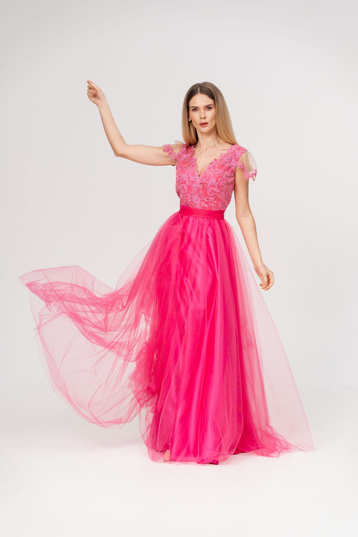 Aceasta rochie lunga din tul si satin este alegerea ideala pentru ocazii speciale, imbinand delicatetea dantelei cu fluiditatea materialelor fine. Corsetul decorat cu dantela atent lucrata ofera un aer sofisticat si feminin, in timp ce talia - marcata de un cordon elegant evidentiaza silueta si adauga un plus de eleganta. Fusta din tul vaporoasa creeaza un efect diafan perfect pentru un look gratios si rafinat.
