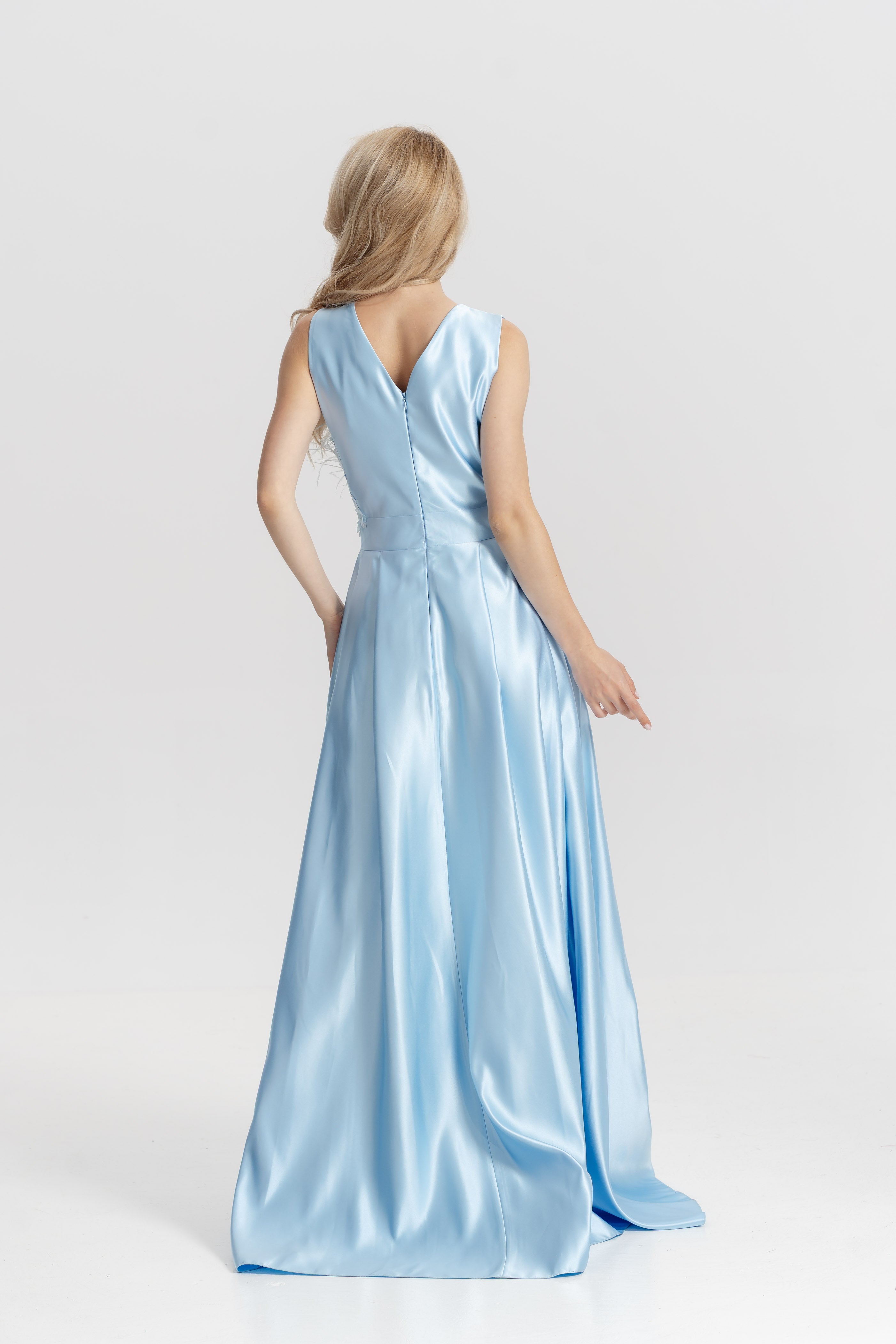 Descopera rafinamentul acestei rochii albastru deschis, perfecta pentru evenimente precum nunti, petreceri sau gala. Designul ei sofisticat, combinat cu detalii florale, te va face sa stralucesti in orice ocazie.