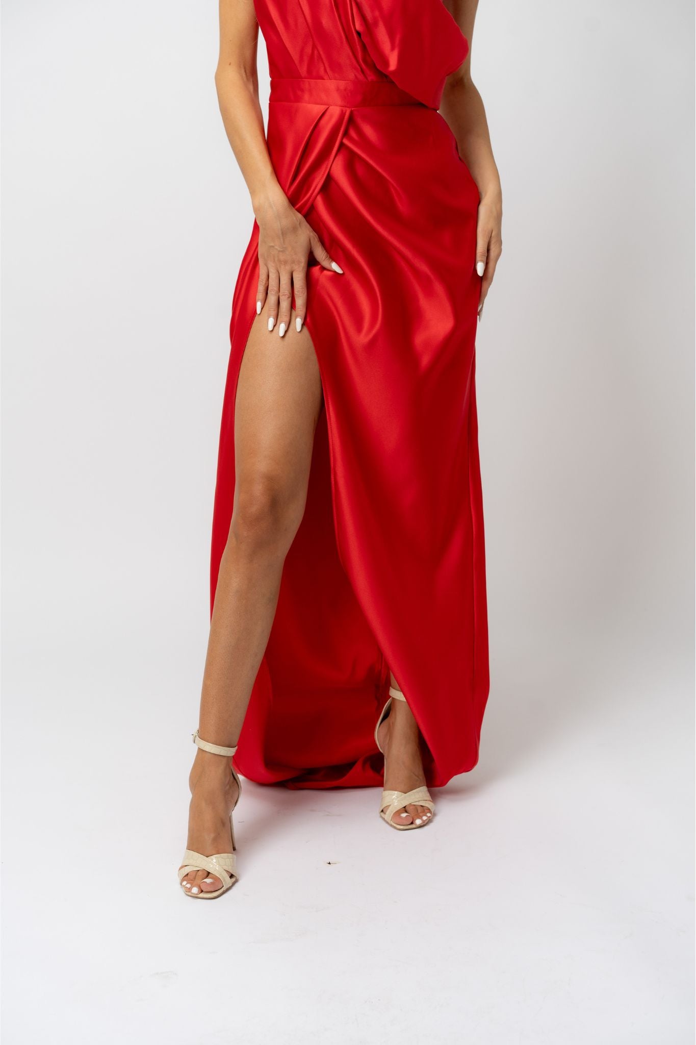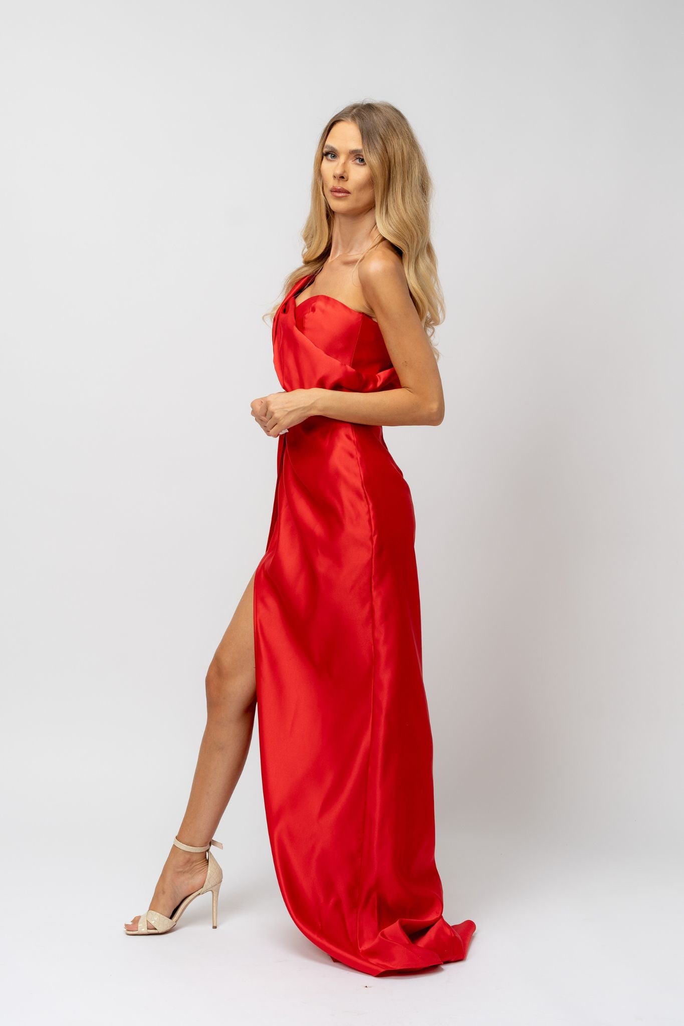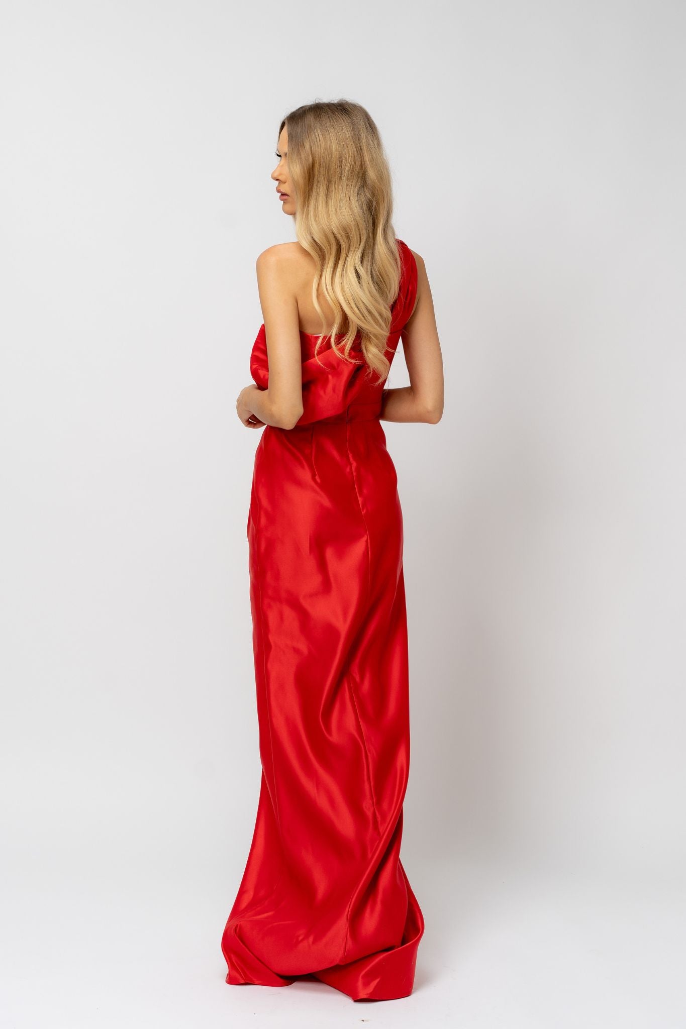 Transforma fiecare aparitie intr-un moment memorabil cu aceasta rochie lunga de ocazie, realizata din tafta satinata cu un design spectaculos. Decupajul asimetric cu un umar gol adauga un aer sofisticat si seducator, in timp ce crapatura pe picior ofera un plus de feminitate si rafinament. Materialul satinat cade impecabil, evidentiind silueta si conferind un aer sofisticat.