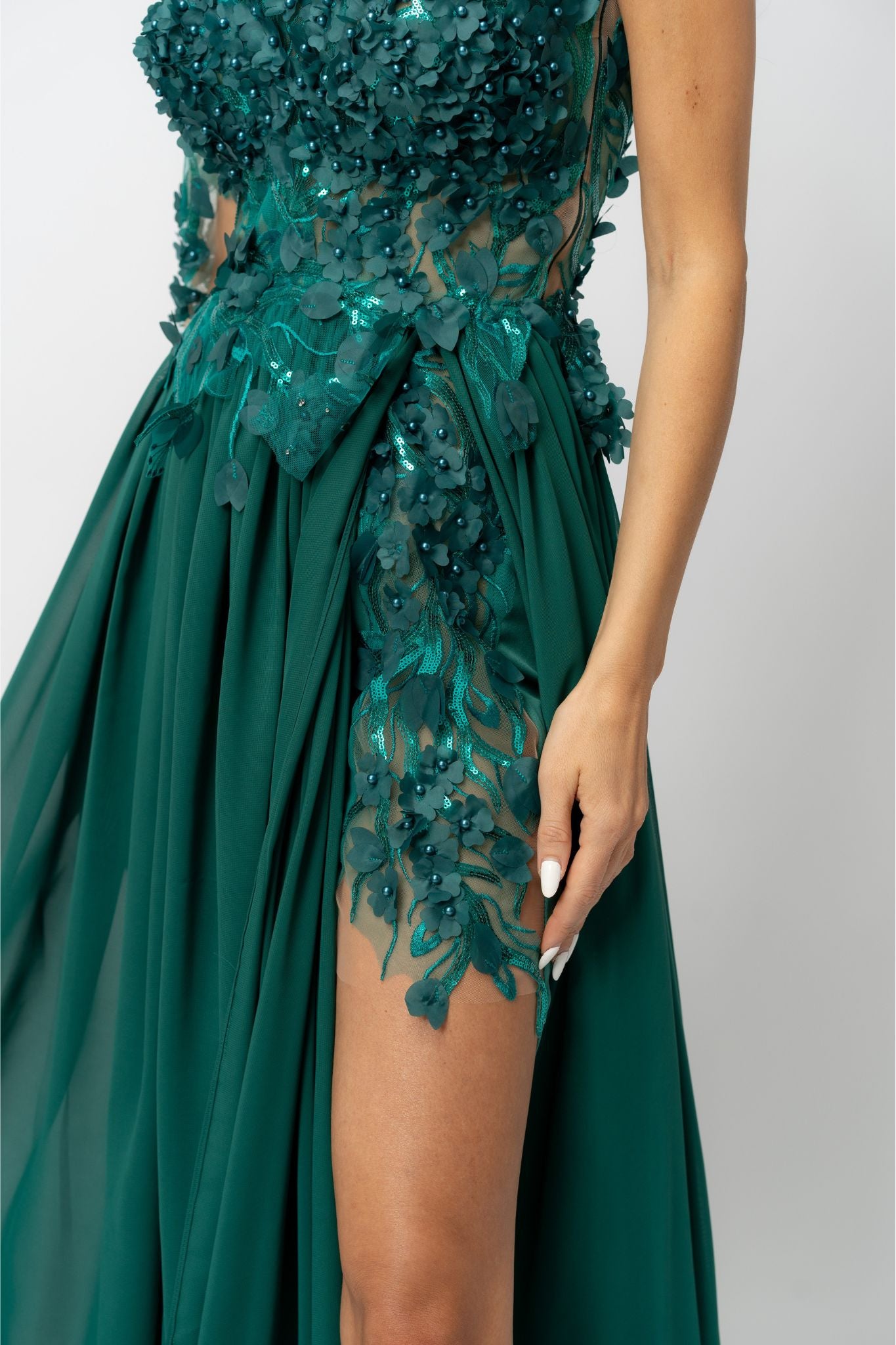 Partea superiora a rochiei este realizat din dantelă 3D iar fusta este confecționata din voal fin.