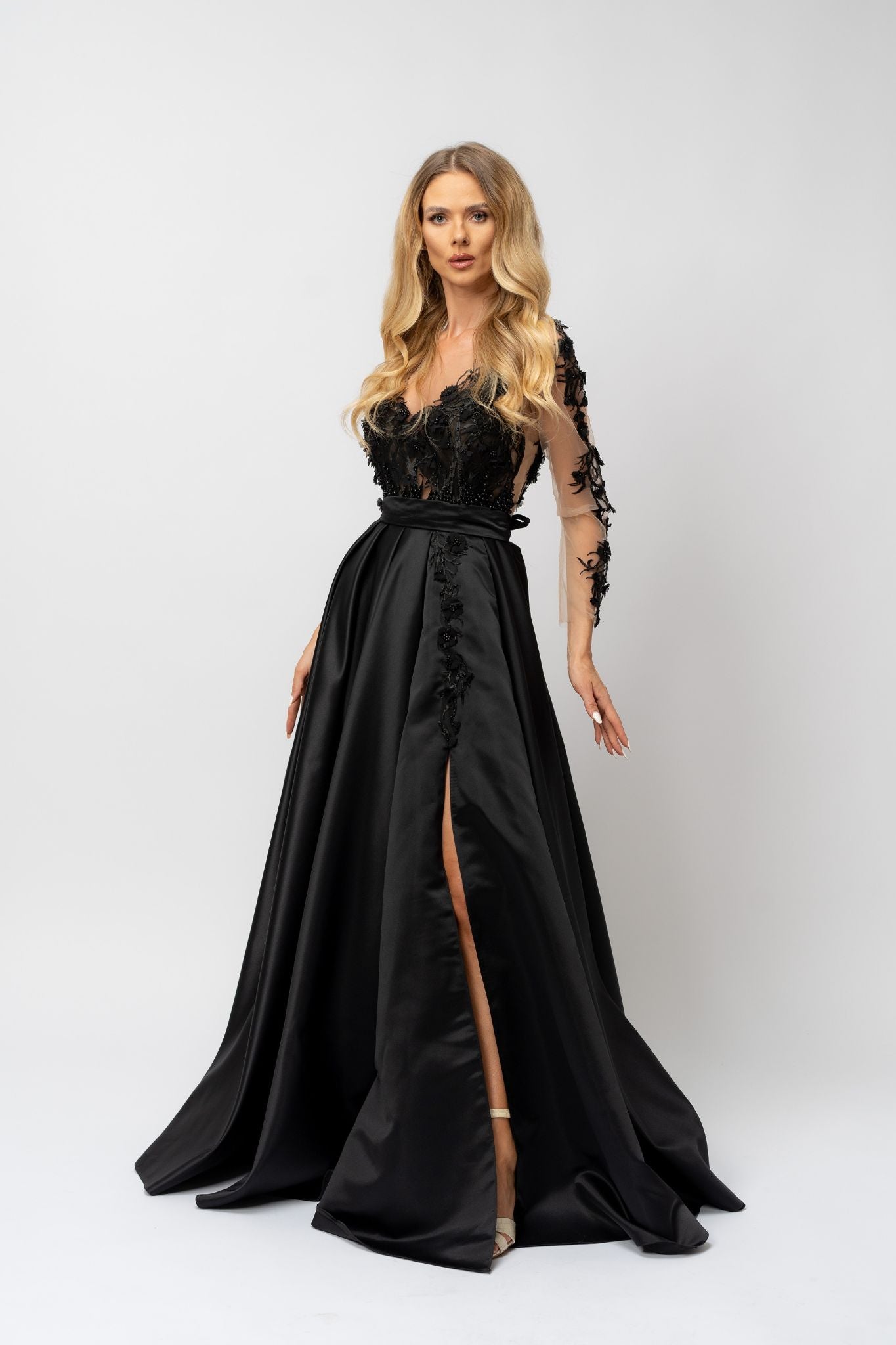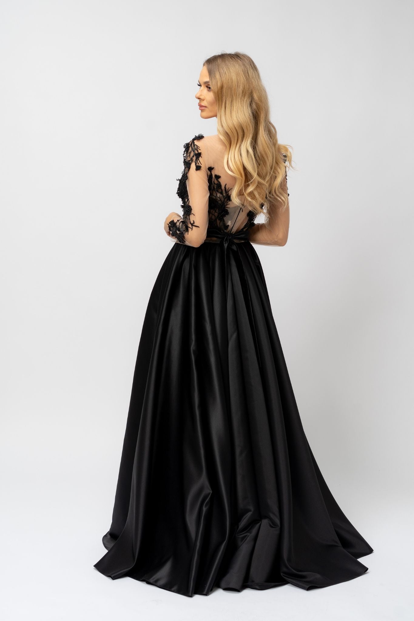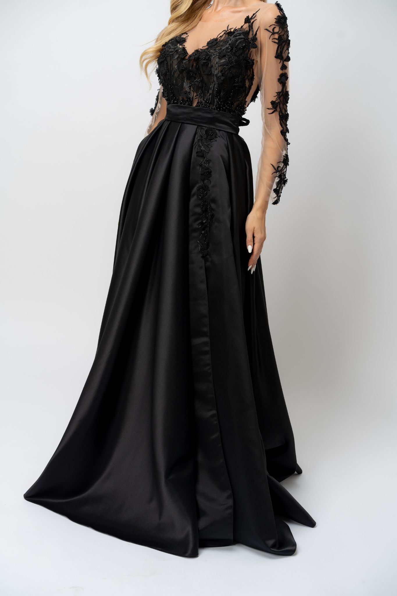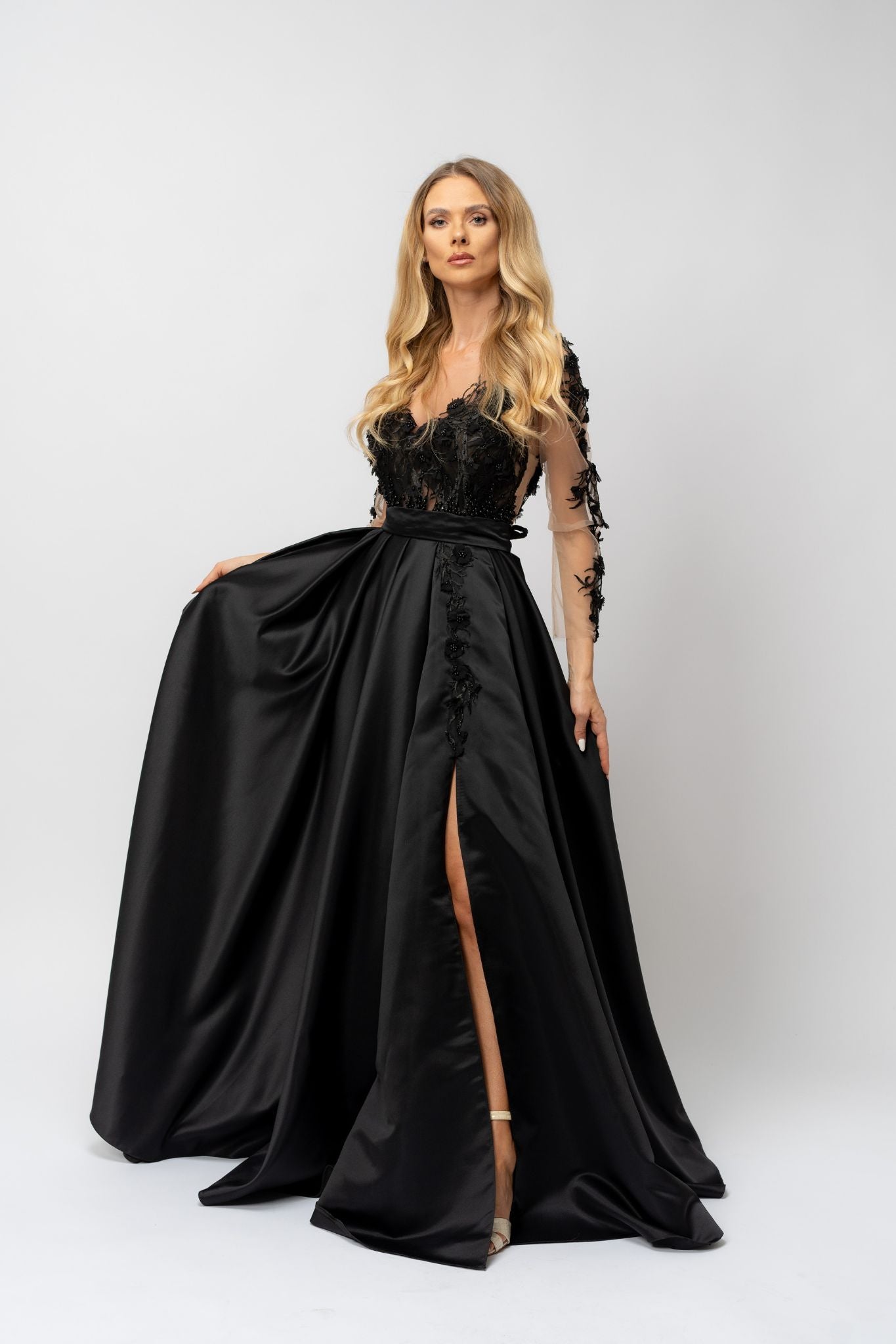 Fii stralucitoare la orice eveniment cu aceasta rochie lunga de ocazie, perfecta pentru un look sofisticat si elegant. Partea superioara este decorata cu dantela 3D fin lucrata, oferind un efect rafinat si feminin, in timp ce fusta ampla din tafta satinata adauga un plus de eleganta si fluiditate. Croiala avantajeaza silueta, evidentiind delicat talia si alungind vizual linia corpului.