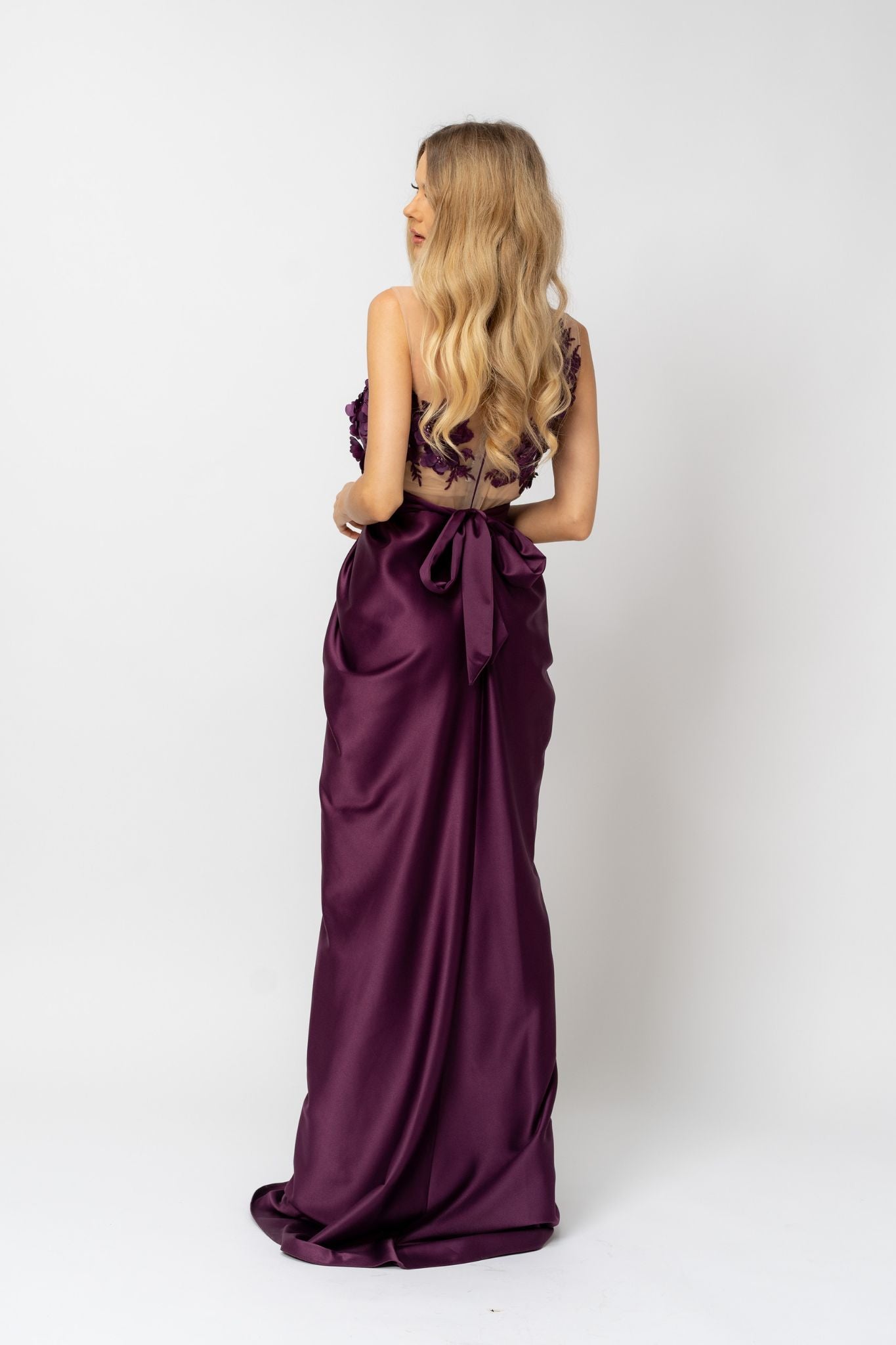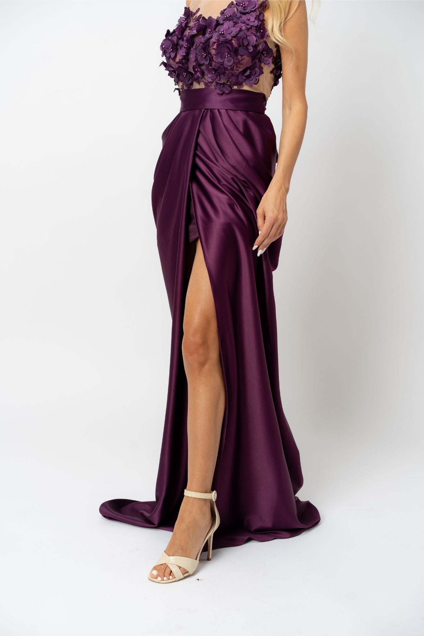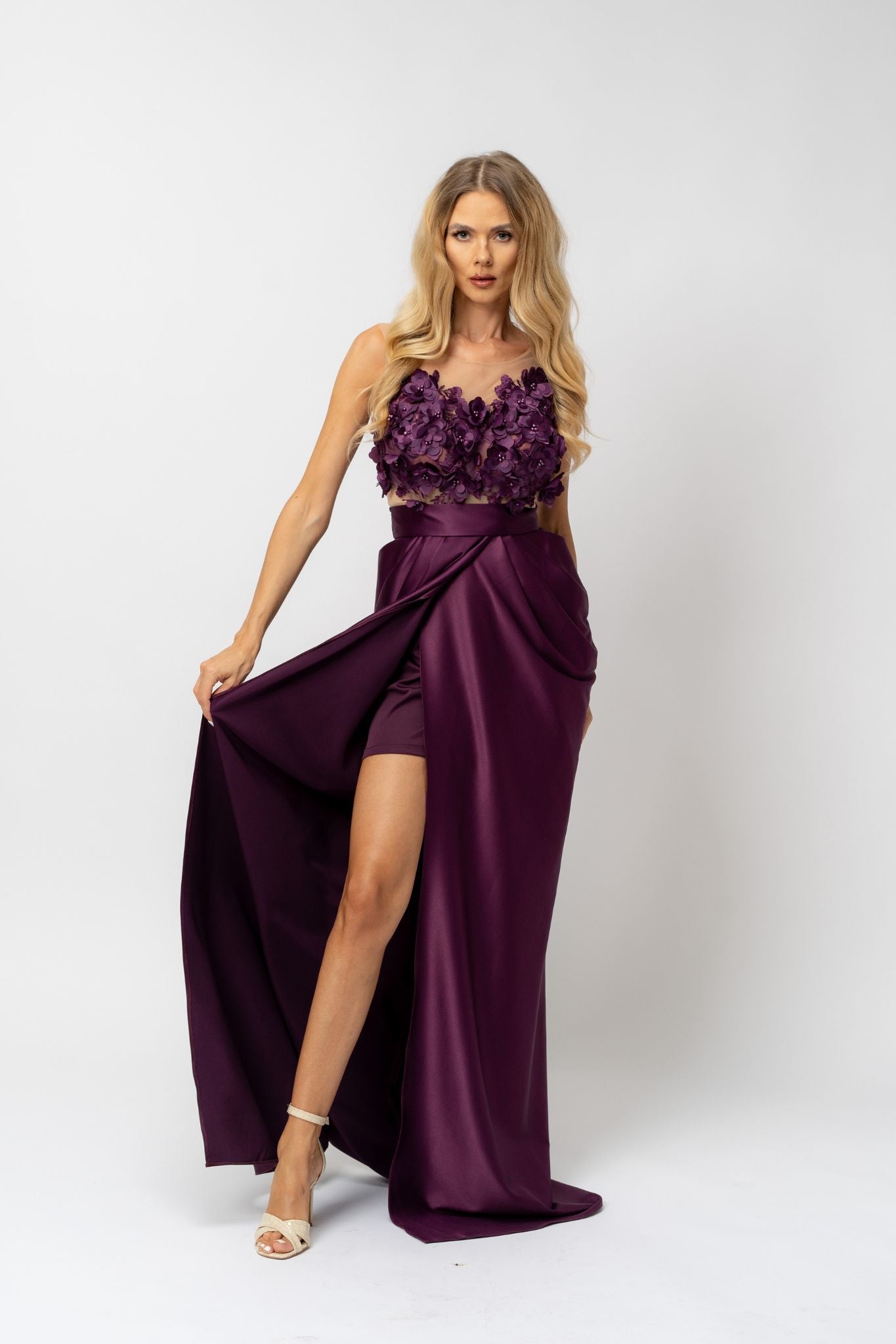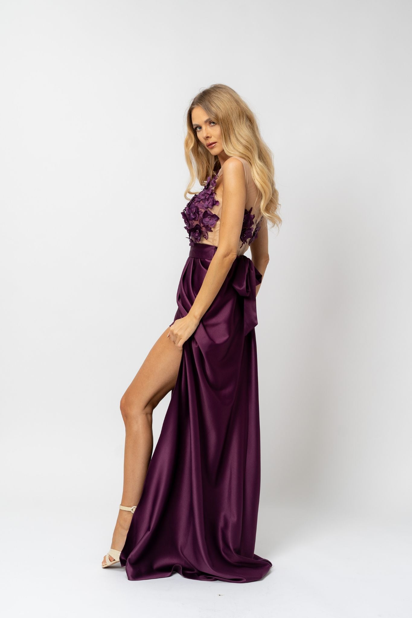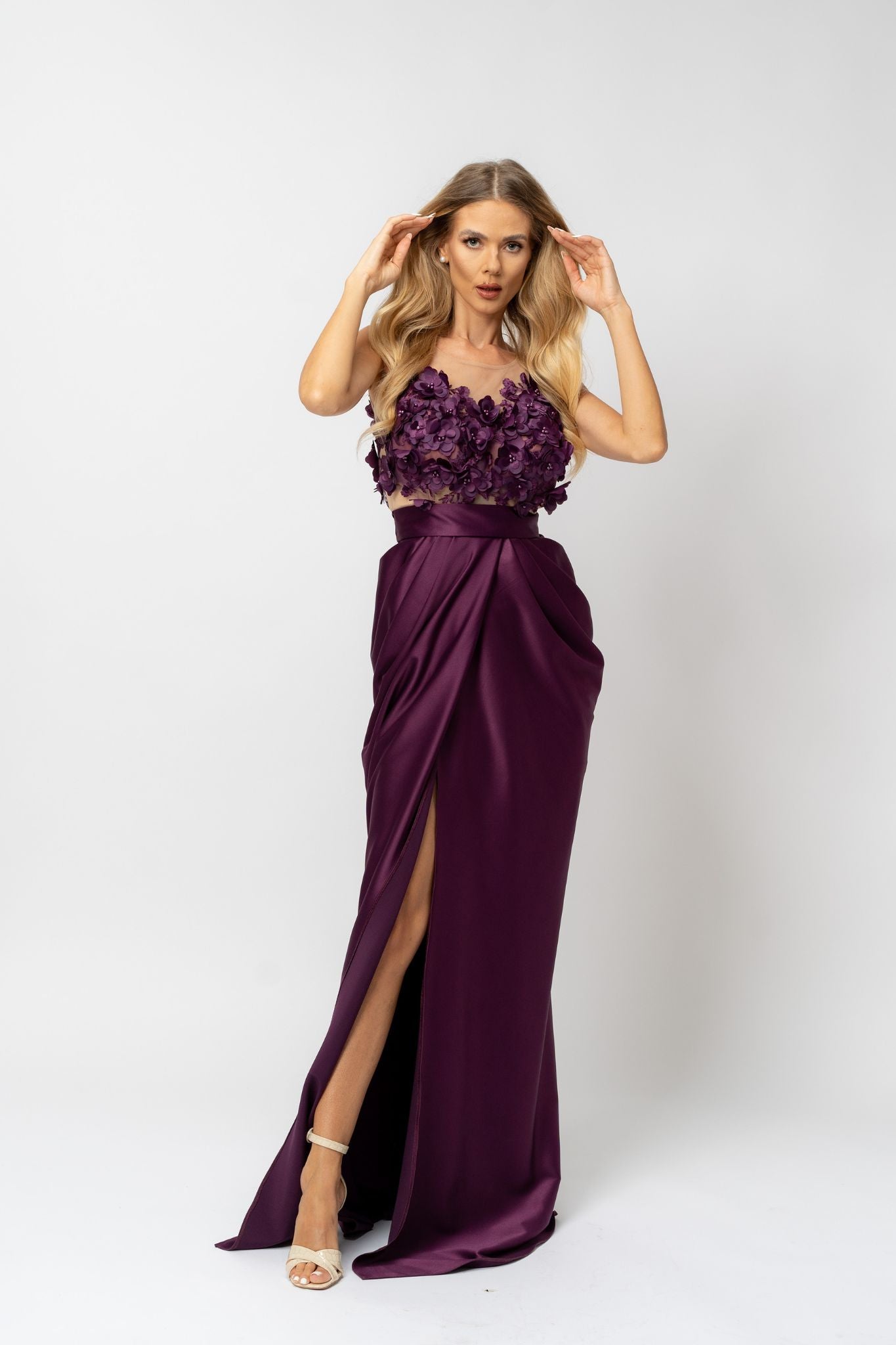 Fii stralucitoare la orice eveniment cu aceasta rochie lunga de ocazie, perfecta pentru un look sofisticat si elegant. Partea superioara este decorata cu dantela 3D fin lucrata, oferind un efect rafinat si feminin, in timp ce fusta ampla din tafta satinata adauga un plus de eleganta si fluiditate. Croiala avantajeaza silueta, evidentiind delicat talia si alungind vizual linia corpului.