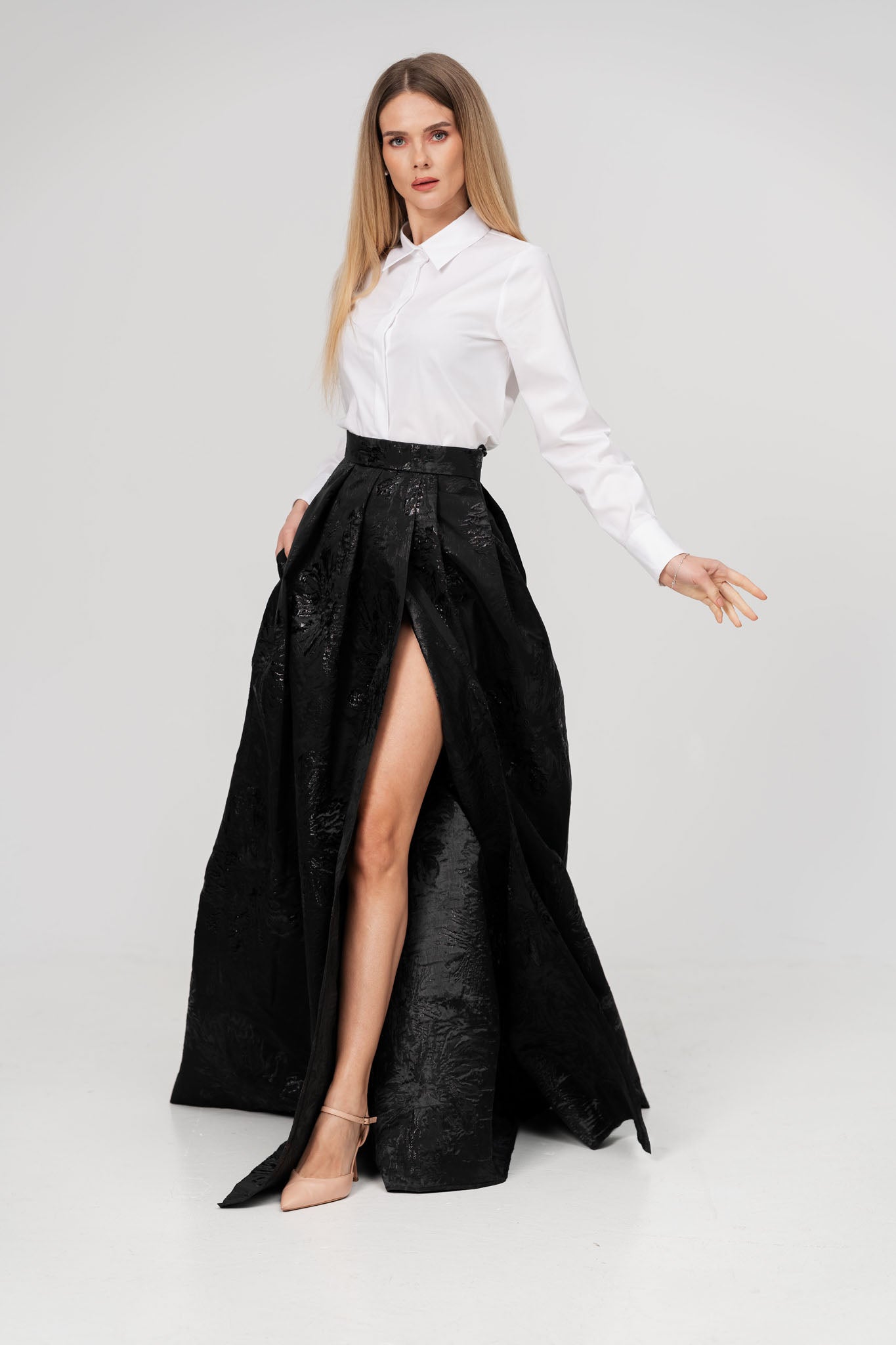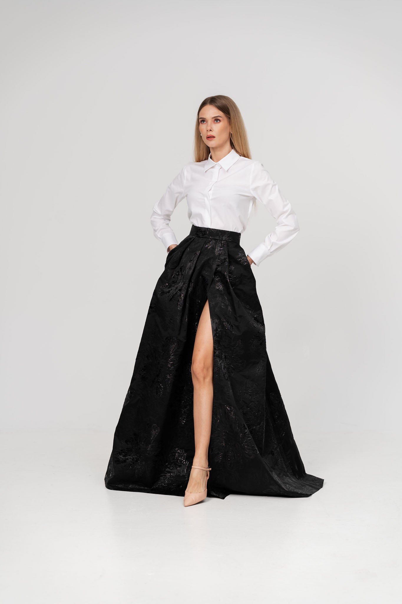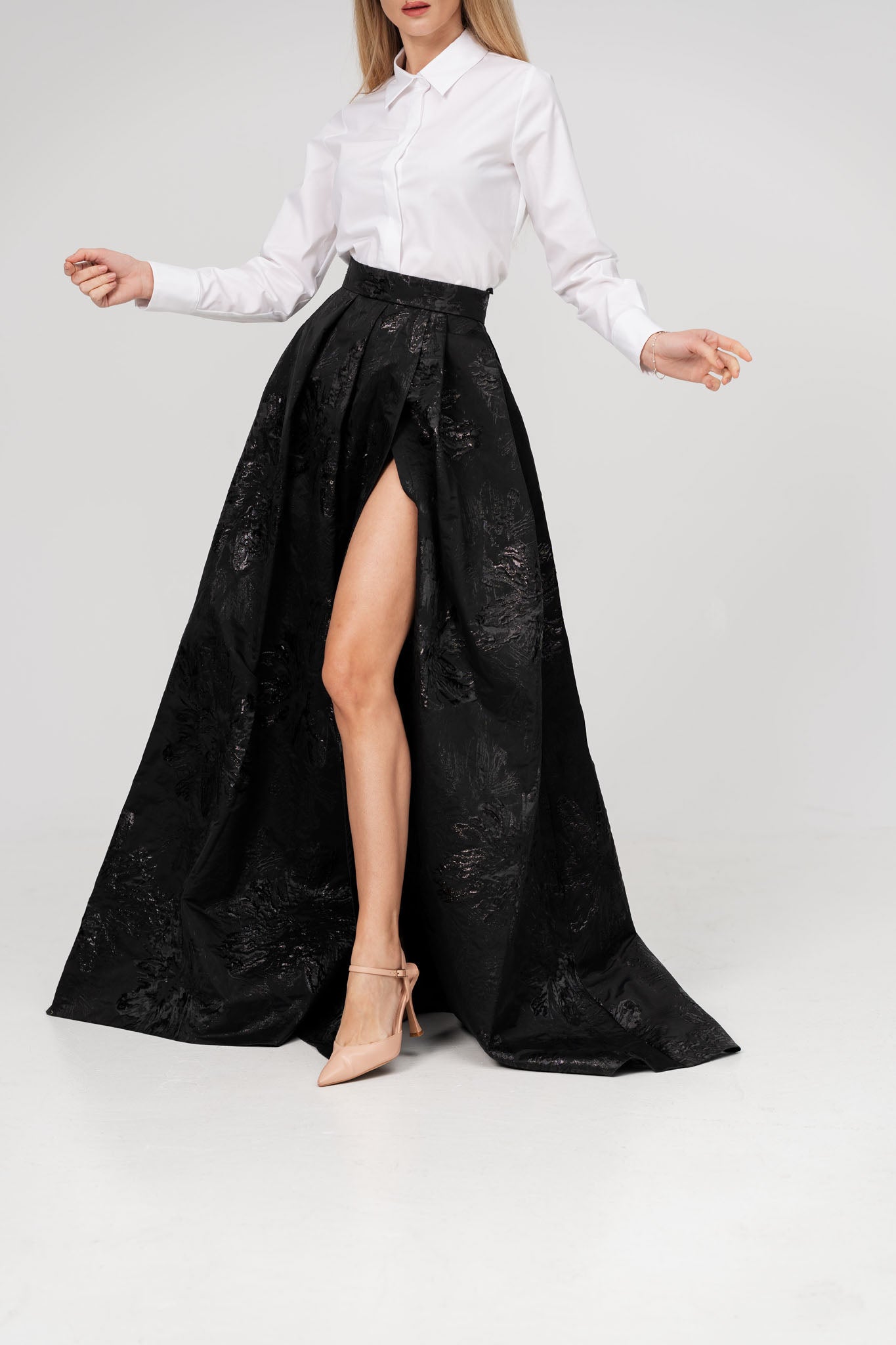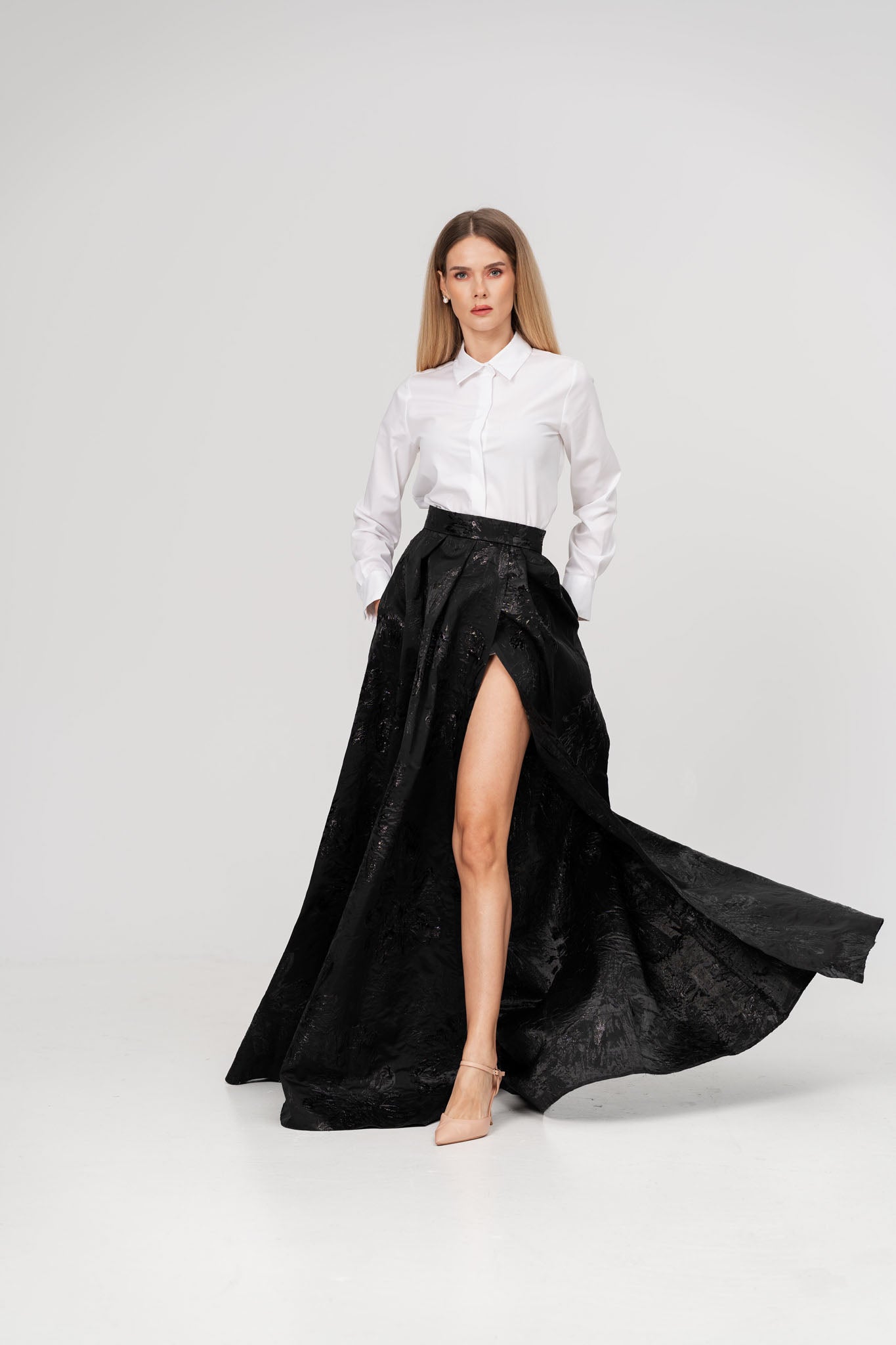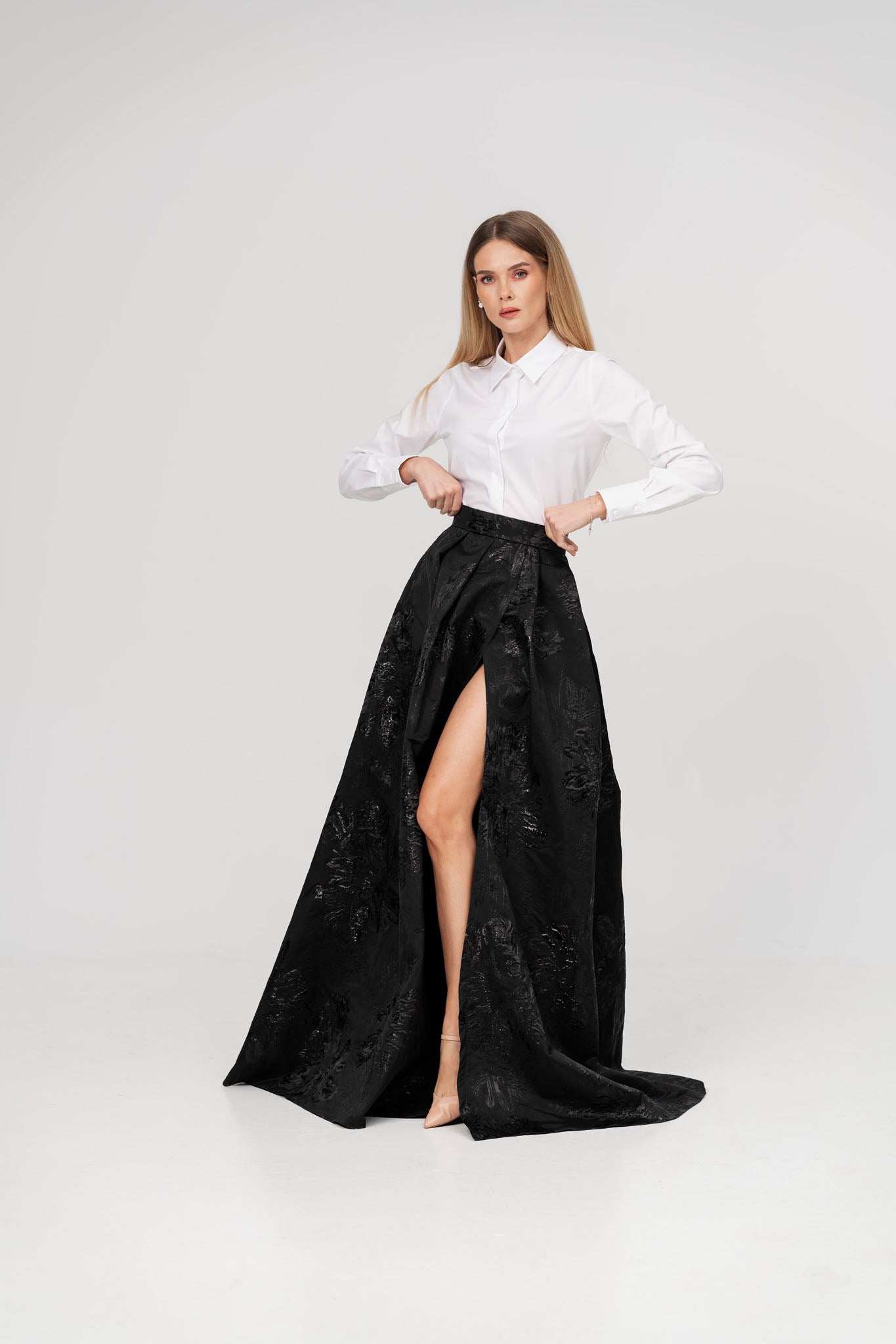 - Design: Fusta are un croi lung, cu o fanta laterala care iti pune in evidenta silueta. Detaliile brodate adauga o textura unica, transformand aceasta fusta intr o piesa statement.