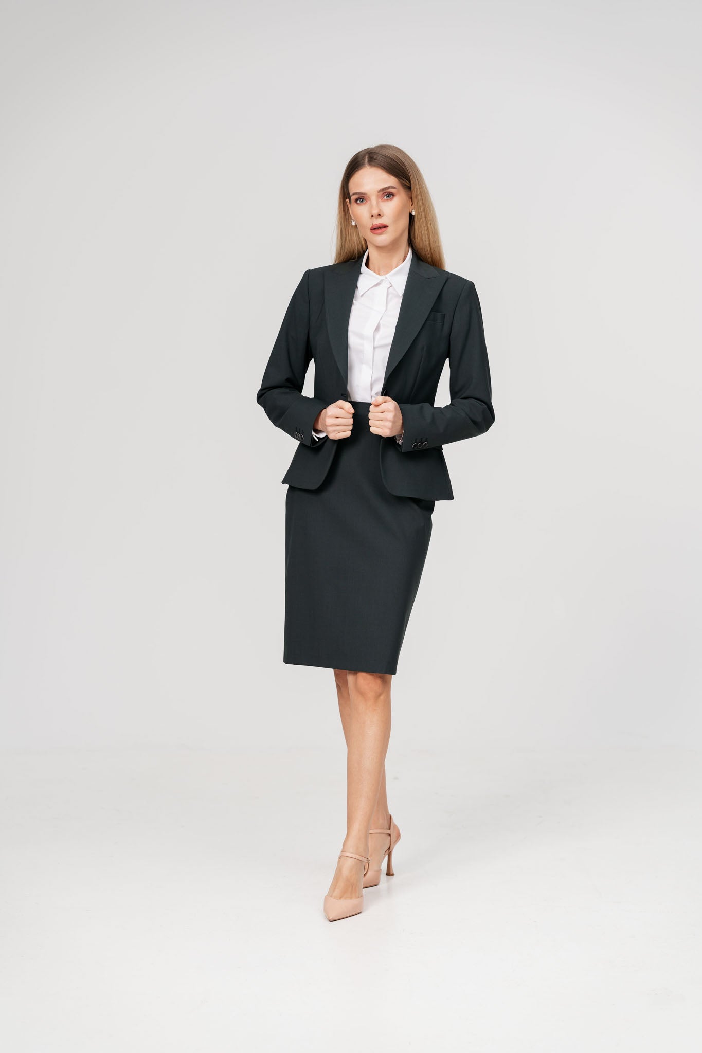 Completeaza-ti garderoba business cu acest sacou cambrat si fusta office, combinatia perfecta pentru un look profesionist. Fabricat dintr-un material de buna calitate, acest costum este placut la purtare, perfect pentru zilele active la birou. Acest costum verde iti ofera o silueta feminina si eleganta, fiind potrivit pentru birou, intalniri de afaceri sau evenimente corporate.